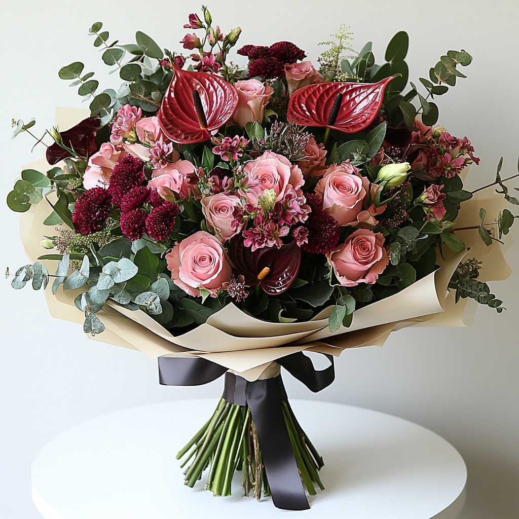 A luminous verse spun from the delicate artistry of fleurology and the eternal poetry of nature, the Heart’s Muse Bouquet blooms with a sophisticated brilliance that kindles the soul’s quiet yearnings. Crafted from the freshest, most vibrant flowers, this enchanting arrangement sings with the deep, soulful richness of maroon blooms, their velvety petals whispering tales of timeless passion, entwined with the warm, peachy pink flowers that glow like the tender blush of dawn’s first promise. Sprigs of wild green foliage weave through this poetic tapestry, their untamed elegance rooting the bouquet in the heart of nature’s boundless grace. Uplifting and profoundly poetic, Heart’s Muse is a radiant gift for moments of love, reflection, or heartfelt connection, its blooms a vibrant ode to the soul’s unspoken dreams. Let this bouquet cast its gentle spell, enchanting hearts with the luminous beauty of nature’s most tender muse.