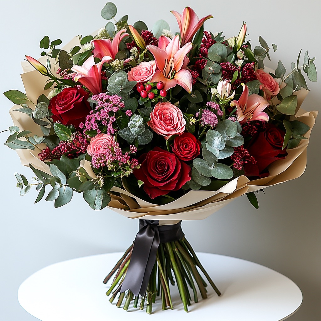 A luminous canto inspired by the delicate craft of fleurology and the boundless poetry of nature, the Roseate Bouquet blooms with a sophisticated brilliance that kindles the heart. Woven from the freshest, most radiant flowers, this enchanting arrangement sings with the fiery passion of bright red blooms, their vivid petals pulsing with vibrant life, entwined with the soft warmth of peach and the tender blush of pink flowers. Sprigs of wild green foliage weave through this vibrant tapestry, their untamed elegance anchoring the bouquet in nature’s eternal embrace. Uplifting and resplendent, Roseate is a poetic offering for moments of love, celebration, or quiet reverie, its blooms a radiant hymn to the art of the natural world. Let the Roseate Bouquet cast its spell, enveloping hearts in the glowing embrace of a rose-hued dawn.